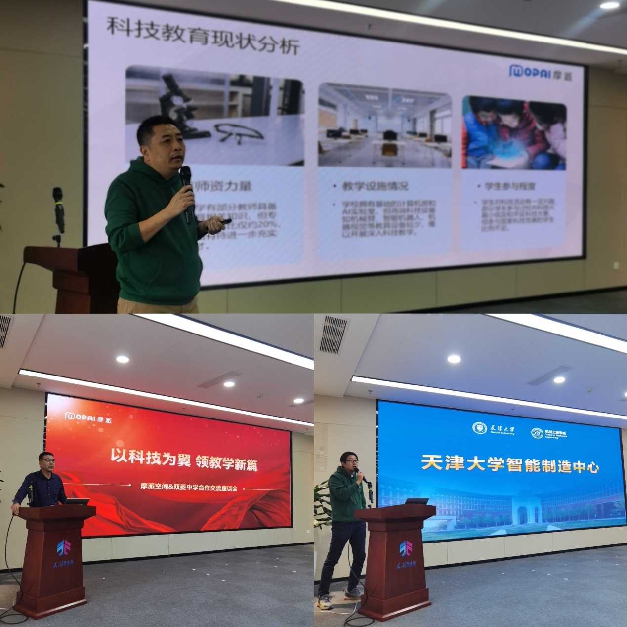 摩派空间联合创始人兼总裁李志洪、中国软件行业协会理事,嵌入式系统工程委员会委员,青少年信息学奥赛天津地区总教练,多届中学生创新创意大赛前三名指导教师,原天津大学自动化学院老师,摩派空间特邀顾问刘全礼老师及摩派空间联合创始人兼副总裁丁雅斌教授分别从校企合作构建科技教育生态,中学创客教育的政策、路径、成效解读及依托天津大学机械学院硬核资源赋能学生创客未来三个维度进行了详细的阐述。